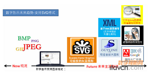 你或許知道JPG、BMP、GIF或是PNG,但你可能沒有聽過SVG!因此還無法理解它與數(shù)字告示之間的關(guān)系。SVG是目前最火熱的圖像文件格式了,它的英文全稱為Scalable Vector Graphics,意思為可縮放的矢量圖形。它是基于XML(Extensible Markup Language),由World Wide Web Consortium(W3C)聯(lián)盟進(jìn)行開發(fā)。