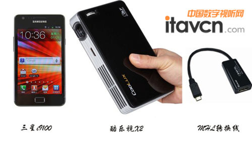 手機,筆者使用的是三星i9100,雙核處理器,安卓系統,配有Micro usb接口;微型投影機,筆者選擇的則是酷樂視X2最新的16G版,這是一款高清(物理高清,兼容1080P)微型投影機,物理分辨率達到1280*800(兼容1080P),亮度400流明,能夠滿 足家庭開燈環境下的使用,當然,最看重的還是,在如此強悍配置下,其他品牌的類似機型,均不帶電池,需要外接電源適配器或電池盒,而酷樂視是目前全球唯一 一款內置電池的高清投影機;再配上一根MHL轉接線,MHL線現在淘寶上賣得還是比較多,價格大概在100元左右。這就是需要的所有裝備了。