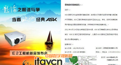 【中國數字視聽網訊】ASK作為全球投影機著名品牌,近期推出其全新工程投影機,并啟動E2系列工程機新品全國巡展。第一站將于2012年8月24日在北京海潤艾麗華大酒店舉行。會議現場將展示ASK投影在工程領域的產品優勢以及分享經典案例,歡迎業內人士及媒體朋友的光臨。