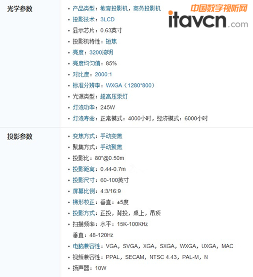 ASK超短焦投影機(jī)US1320 參數(shù)