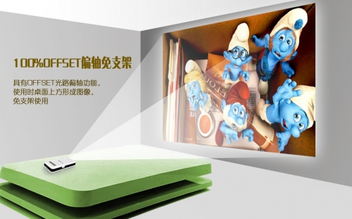 由于美高G3微隨身便攜投影,采用了100%OFFSET偏軸投射技術(shù),光線在所置卓面上方形成圖像,使用免支架。