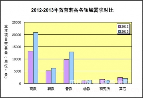 需要特別指出的是:教育裝備政府采購領域其中包括信息化設備、實驗室設備、職教實訓設備、文體器材、校用家具、學前裝備和后勤設備等七類交易項目。本文采用的數(shù)據(jù),來源于政府采購體系中各類教育裝備交易項目的公開信息,尚有一些地方或較小交易項目未列入其中。文中所涉及2012全年和2013全年的教育裝備采購單位,包括各級各類院校、教育管理部門、研究所等。文中實驗室設備包括實驗室常規(guī)設備、分析儀器、專用儀器(環(huán)境、生物、地理、農(nóng)業(yè)等領域);學前裝備指幼教室內(nèi)玩具、室外玩具及幼教家具等;校用家具包括課桌椅、宿舍家具、實驗室家具、辦公家具等;普教的教育裝備采購內(nèi)容包括中小學理、化、生等實驗室設備。