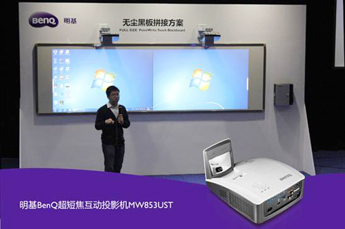 PointWrite互動(dòng)技術(shù),作為明基獨(dú)有的互動(dòng)技術(shù)已經(jīng)全面上市,2013年后推出的短焦新品均可以搭載互動(dòng)模塊使用。MW853UST可搭載原廠PW01U互動(dòng)模塊,加裝互動(dòng)模塊后,最多可以支持4只筆在同一個(gè)畫(huà)面上書(shū)寫(xiě),如果選配最新手觸功能PT-01模塊,還可以實(shí)現(xiàn)多點(diǎn)手觸的功能。有了這種技術(shù),老師在教學(xué)時(shí)可以直接使用手指在平面在書(shū)寫(xiě)標(biāo)注,還將支持WIN8系統(tǒng)下的手勢(shì)操作,大大提升使用者使用體驗(yàn)。如果還不過(guò)癮,MW853UST的軟體還支持雙通道拼接互動(dòng)功能,可從一臺(tái)PC上接出2條信號(hào)線給2臺(tái)投影機(jī),現(xiàn)場(chǎng)搭建的方案就是可在超寬的互動(dòng)畫(huà)面上從左寫(xiě)到右,非常過(guò)癮。從實(shí)際使用的效果來(lái)說(shuō),渠道伙伴們都反饋明基MW853UST的使用體驗(yàn)及易用性方面已經(jīng)超越普通電子白板,加上相對(duì)白板在物流及售后便利性上的顯著優(yōu)勢(shì),必然在未來(lái)的教育市場(chǎng)上大放異彩。