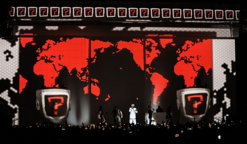 舞臺背景設計新穎復雜,三個大型充氣式頭像成為舞臺最引人矚目的亮點,頭像主要用于呈現will.i.am的面部畫面,保持頭像嘴型與歌聲的同步。三個頭像上各有一位DJ。此外,還有三幅下拉式投影屏幕。如何確保270度投影完全映射而沒有任何陰影,是整個設計執行所面臨的挑戰,這需要每臺投影機在各個場地上的定位精確,并且每臺機器都要擁有專門的視頻輸入。