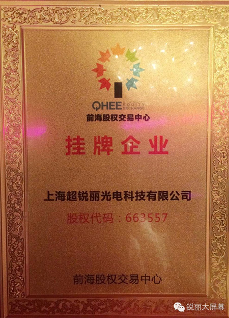 【中國數字視聽網訊】6月28日,上海超銳麗光電科技有限公司在深圳前海股權交易中心掛牌展示,企業代碼為663557。銳麗總經理孫安君表示,借助高速發展的信息化手段,引進先進的企業管理機制和企業文化,同時依托前海股權交易中心這一平臺,充分利用資本市場促進企業發展的功能,整合資源、規范動作。使銳麗健康、向上、快速地發展,成為拼接大屏幕行業第一品牌。
