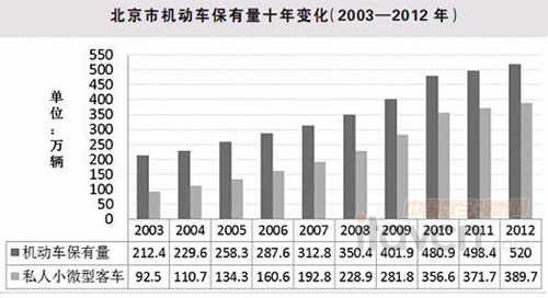 相比于電視,廣播行業(yè)近幾年發(fā)展情況良好,這一方面是因為穩(wěn)定的老年用戶,另一方面則是因為急劇膨脹的汽車市場。下圖為北京交通發(fā)展研究中心在2013年發(fā)布的“北京機動車保有量十年變化”表。