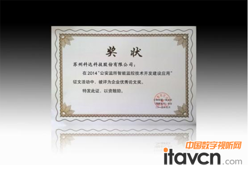 【中國數字視聽網訊】近期,公安部監管局聯合公安部《警察技術》雜志社舉辦“全國公安監所智能監控技術開發建設與應用”征文活動,面向全國征集監所智能監控技術應用論文。經過來自公安部監所管理局、部屬研究院所、各省級公安監管業務指導部門專家的共同努力,此次征文活動在132篇論文中共評選出了33篇獲獎論文,其中,公安監管部門一、二、三等獎共29名,企業優秀論文獎僅3名。蘇州科達科技股份有限公司提供的《淺談公安監管場所智能監控技術現狀及發展》一文成功入選企業優秀論文獎,并刊列第一。