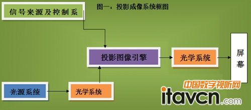 一個標準的投影成像系統如下圖一所示,包括:信號來源及控制系統;投影光源系統;圖像引擎系統;光學系統以及投影屏幕系統等五個組成部分。