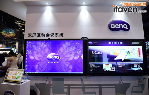 針對現代商務會議對大型多媒體系統的應用需求,明基于InfoComm展會現場同時展出兩套各具特色的智能拼接解決方案。其中之一,為明基首發的雙屏互動會議系統,采用目前市場唯一的79英寸4K超清觸控液晶一體機進行拼接,令顯示尺寸達到143英寸、最大分辨率達8KX4K,從而能顯示更大更清晰的畫面內容。此外,它們既支持10點紅外觸控,也搭載更智能更易用的無線互動軟件,從而令商務溝通效益大增。