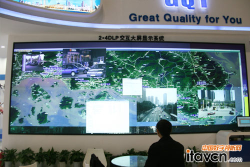 展會現場,GQY展示的DLP交互大屏顯示系統人氣頗高。據現場工作人員介紹,該系統大屏為2x4的80英寸高亮激光光源DLP拼接屏,屏前亮度可達2000流明以上,其采用超高物理分辨率的光學引擎,可以顯示細膩、精致的超高分辨率信號,如GIS、GPS矢量地圖、高分辨率圖形等。值得一提的是,該系統軟件采用了NPDS綜合顯示平臺,以分布式信號輸入、分布式顯示、分布式部署技術為基礎的純網絡拼接顯示處理系統,完全滿足對大數據的分析、處理及顯示,已經廣泛的應用于公安、交通等行業。