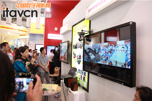 在湖南省展館,湘西鳳凰縣展出的“‘1+N’少數(shù)民族地區(qū)網(wǎng)絡(luò)共享課堂”, 為農(nóng)村的孩子插上了藝術(shù)的翅膀,讓農(nóng)村的孩子與城市里的孩子共享藝術(shù)資源,同上藝術(shù)課。以展區(qū)為主講教室,現(xiàn)場的老師與遠在湘西的兩個聽課教室的學(xué)生,進行了遠程教學(xué)互動,引來觀眾駐足觀望。