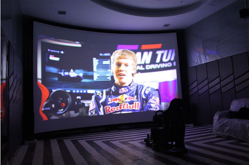 “此次方案設計中,我們重點強調的是圖像的高清分辨率和出色的音響效果。”負責此次項目的鴻合科技相關人員表示,而這也正是現場逼真效果的保障。據了解,現場采用的是NEC激光工程投影機NP-PX602UL-BK+,該投影機使用激光光源,分辨率均達到了1920×1200,同時支持4K高清。此外,NEC激光工程投影機NP-PX602UL-BK+采用全新CQP影院級圖像處理器和先進的激光熒光體投影技術,可實現色彩鮮艷的畫面,能夠把自然景色逼真的呈現出來,給“駕駛者”更加真實的賽車體驗。音響方面則采用國際知名品牌惠威的7.1聲音系統(tǒng),帶來真實的引擎音效,讓人熱血滂湃。