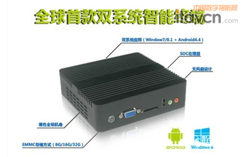 【中國數字視聽網訊】S015是一款內置標準Nano-ITX主板的迷你型終端,黑色系全鋁機身、無風扇設計,搭配Intel最新的Bay Trail系類SOC,板貼EMMC存儲顆粒(16G/32G),是Intel與JWIPC共同設計研發的全球首款完美支持Windows 7/8.1和安卓雙系統的產品。