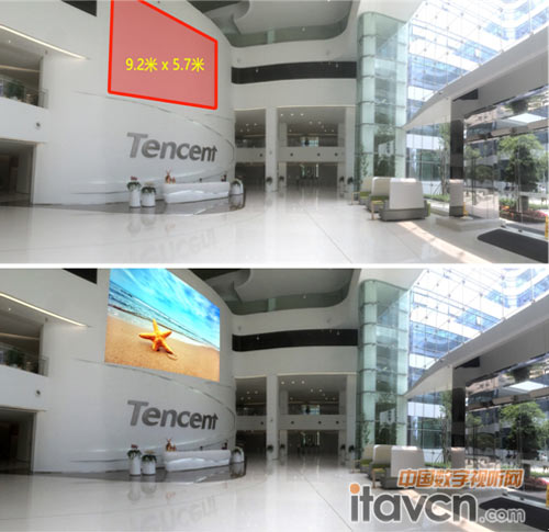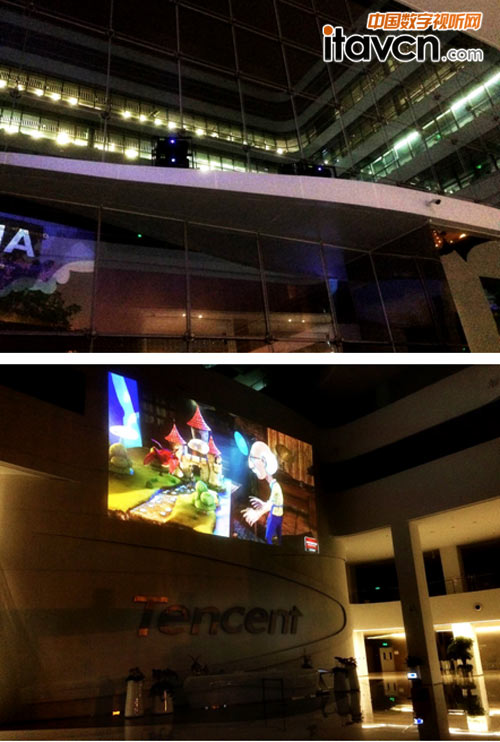 成都騰訊大廈A樓大廳背景墻上。并采用的是當(dāng)下最為流行的四臺(tái)松下激光工程投影機(jī)PT-FRZ98C。