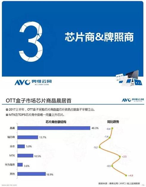 芯片商方面:2017上半年,OTT盒子采購芯片商晶晨芯片依然占據盒子半壁江山;MTK在TOP5芯片商中是唯一用量上升芯片。OTT盒子主流芯片TOP10中,晶晨S905X占比為14.1%;其中,MTK8685A份額上升幅度較大,同比上升8.6個百分點。