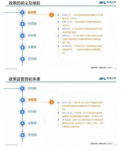 2. 探索期:政策監管首輪來襲。互聯網電視牌照制度形成;并影響最為深遠的181號文出臺,對內容集成、內容服務、運營以及終端管理都有相關細則。