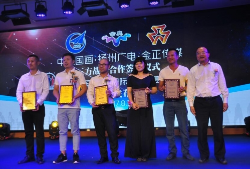 在授權儀式上,中航國畫(上海)激光顯示科技有限公司總經理錢仕良代表中航國畫與揚州電廣新媒體傳播有限公司董事長巢亮、揚州金正傳媒文化有限公司董事長騰兆金簽署了三方戰略合作協議,中國航空工業集團上海航空電器有限公司董事長、黨委書記、中航國畫(上海)激光顯示科技有限公司董事長蒲毅為金正傳媒董事長騰兆金頒發了授權銅牌,同時也為其他地區的代理商授牌。隨后,揚州本地行業客戶代表也與揚州廣電公交頻道簽訂合作協議,共同推廣中航國畫家用系列激光投影機。