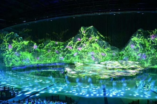 如夢似幻的場景,仿佛置身仙境。相信這是所有觀看過《滿秀》的觀眾們最深切的感受。為了營造預(yù)期的效果,《滿秀》應(yīng)用世界頂級聲光電、水霧火技術(shù)。舞臺演出備有2000噸水用于模擬山洪暴發(fā)場景,噴火裝置更是設(shè)置了近百個之多,場景非常宏大。