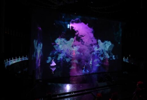飄煙不見煙,舞臺上的煙霧繚繞其實就是投影機和紗幕配合下形成的效果。透過青煙還能看到后面的演員,迷離夢幻,恍若仙境。