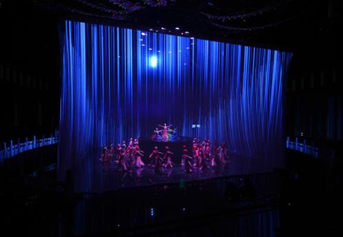 據了解,舞臺上共配置了20臺31,000流明的松下工程投影機,其中8臺垂直安裝于舞臺頂部用于投射舞臺地面,12臺吊裝在棚頂四周投射環繞在舞臺中央的紗幕。