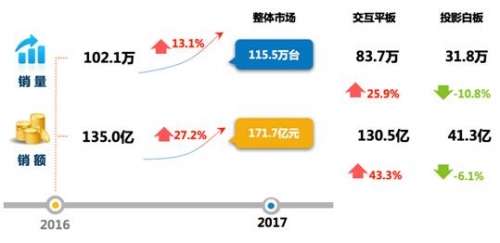 從2017年上半年數據和第三季度數據來看,中國IWB市場整體形勢看好。其中,交互智能平板作為IWB市場主要拉動力,銷量同比上漲25.9%,繼續呈良好的發展態勢。而投影白板仍維持下降趨勢,銷量同比下降10.8%。報告預測,交互智能平板將維持穩定增幅。