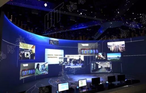 指揮中心演示廳是一個半徑約9m的圓型空間,高約6.9m。主要分為屏幕主投影顯示區及地面沙盤投影。整個大屏幕顯示系統是由投影顯示子系統、顯示控制子系統、用戶信號源系統及相關的配套設備組成。