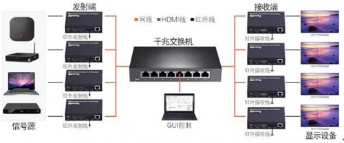 如何安裝組網HDMI多對多MM16延長器,HDMI延長器是指發射端到接端收的一個延長過程,MM16采用網絡IP技術,連接過程中需要通過交換機,MM16發射端到交換機可延長120米,交換機到接收端可延長120米實際應用可最長延長240米。布線方式靈活多變,可以隨信號源任意擺放無需專用機房,安裝簡單方便,最主要是省錢省時省力,通過網線接電腦GUI控制局域網內任一電腦可做控制主機方便實用。