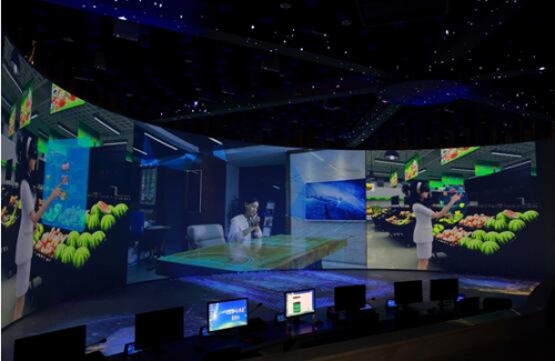 數據指揮中心為了創建數字化展示平臺,使用3臺NEC PH1202HL+正投吊裝,打造出了23.5米*5米超大尺寸主顯示屏幕,成為展廳最大的看點。通過半徑為8.45米的弧形投影對龐大的數據量進行全方位呈現,讓現場觀眾一目了然地獲取信息。