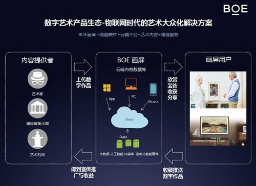 ,其擁有超高規格的顯示技術,海量的精選藝術內容庫、便捷的藝術欣賞交易平臺。用戶可以根據個性化的需求進行不同主題風格、場景內容定制,也可以上傳自己的個人作品推送到BOE畫屏終端,還可利用APP實時傳輸作品與他人分享。同時,BOE畫屏生態也為藝術家們提供了一個展示藝術、傳播藝術的平臺?梢哉f,BOE畫屏所打造的這一生態不僅極大地豐富了普通家庭用戶的生活,也為藝術家進行藝術展示提供了極大的便利。