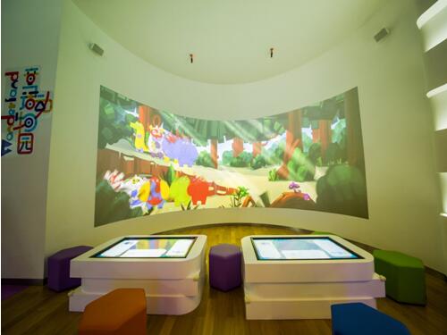 進了童話動物園,孩子可以在這里親切感受大自然的神奇。由3臺NEC P502HL+激光工程投影機完美融合打造的弧幕,為小朋友們提供出一個五彩斑斕的童話世界。在童話王國,孩子們可以借助科技畫筆,為小動物換上新裝,涂上自己喜歡的色彩,超萌超可愛的小動物就展現在孩子們面前了。能有這樣的效果,NEC P502HL+功不可沒,1920*1080全高清分辨率能夠帶來完美、細膩的畫面顯示,加之其搭載的激光光源,呈現出來的色域范圍更廣,能夠實現絢麗多彩的圖像,令動物世界更逼真、生動。孩子們沉浸其中,一定會戀戀不舍,一直拉著爸爸媽媽跟小動物們玩得很嗨!