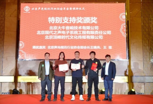 北京大牛音響技術有限公司、北京現代之聲電子系統工程有限責任公司、北京頂峰時代文化傳媒有限公司共3家企業榮獲特別支持獎,王瑞光、王琨嘉賓頒獎。