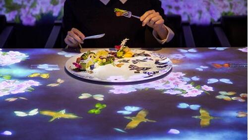 該方案中利用多屏地面互動、電子菜單翻書、360度墻體投影和全息玻璃成像等技術營造夢幻餐廳氛圍,讓消費者享受到有別于傳統餐廳的全新用餐體驗。