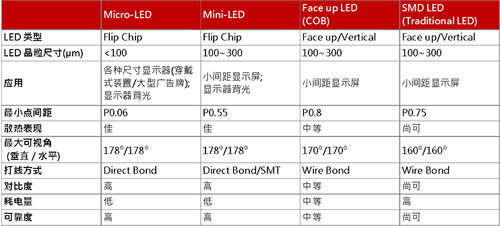 表一、SMD LED, COB, Mini-LED 及Micro-LED 的規(guī)格比較