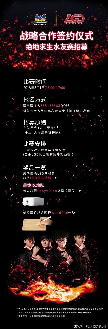 據悉,LGD電子競技俱樂部與ViewSonic優派已通過微博預熱及直播預熱等宣傳方式透露戰略合作資訊,用戶可參與相關活動獲得包括LGD隊服等在內的神秘小禮品。同時,"吃雞"水友可通過報名獲得與LGD戰隊及優派戰隊爭鋒對決的機會,最終吃雞隊將有機會每人獲得BabyVision微型投影機或輕薄竹制繪圖板WoodPad一臺。