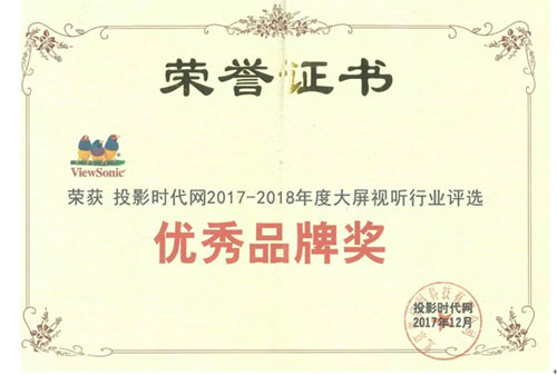在投影時代網舉辦的2017年度大屏視聽行業評選中,ViewSonic優派獲得年度“優秀品牌獎”,在業內樹立了口碑及企業品牌形象,多年來持續為科技行業提供解決方案,讓用戶感受到大屏帶來的便捷及新體驗。