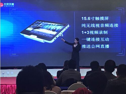 隨著趙總致辭結束,會議開始正式產品講解階段。培訓部經理王瑩對文香2018“拳頭力作”PAD錄播、雙屏錄播產品特點進行了詳細的講解,在場嘉賓均對兩款超高性能、超薄機身、超強性價比的便攜產品表現出濃厚的興趣!接下來,她還對文香合作伙伴——迪樂姆創客產品及和盛前沿工業機器人教育實訓系統進行了詳細講解。