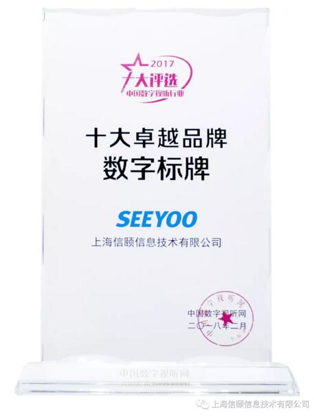 【中國數字視聽網訊】由中國數字視聽網主辦的“2017年度中國數字視聽行業十大評選”活動近期舉行了頒獎儀式,上海信頤信息技術有限公司不負眾望,收獲兩項大獎,被評為“2017年度中國數字視聽行業十大最具影響力品牌”和“2017年度數字標牌十大卓越品牌”。