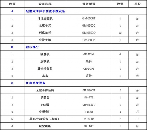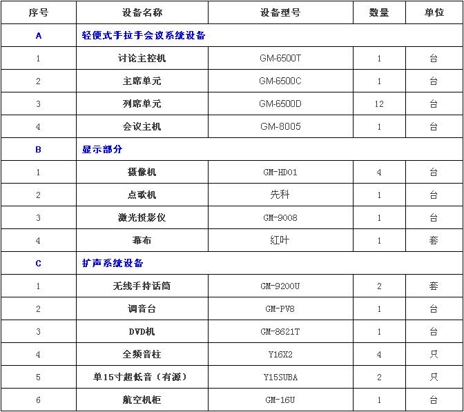 企業某小型會議室,面積約為120平米,平時用作休閑唱歌活動場地;定期用作開各種工作會議,學習上級指示精神;定期對工作做階段性總結、匯報,對工作中遇到的問題進行討論總結;計劃組建一套小型會議及音響系統,要求: