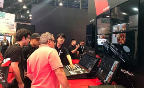 展會現場,MIG-H8控臺和MIG-V6視頻切換臺組成的視頻切換解決方案,最受觀眾歡迎;擁有4K/60Hz 4:4:4 強大視頻圖像處理能力;18.5寸觸控操作、300種用戶預設、T-BAR切換、多路輸出、多路返看輸出、多窗口預監、實時回顯操作等特點;滿足目前市場上主流視頻切換技術的要求,吸引大量客戶的圍觀和體驗,獨占風頭。