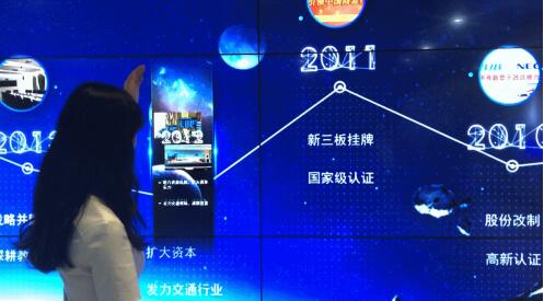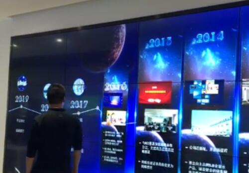 另一種是通過人體移動及動作指示實現與拼接墻上內容的互動,例如在展示頁面時間軸上揮一揮手就可以打開當年公司的大事記。