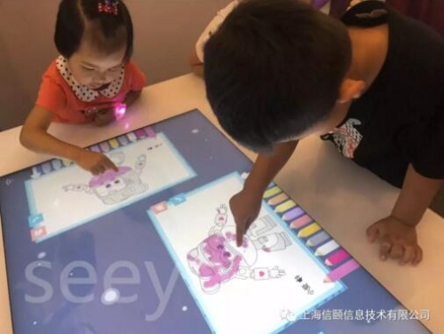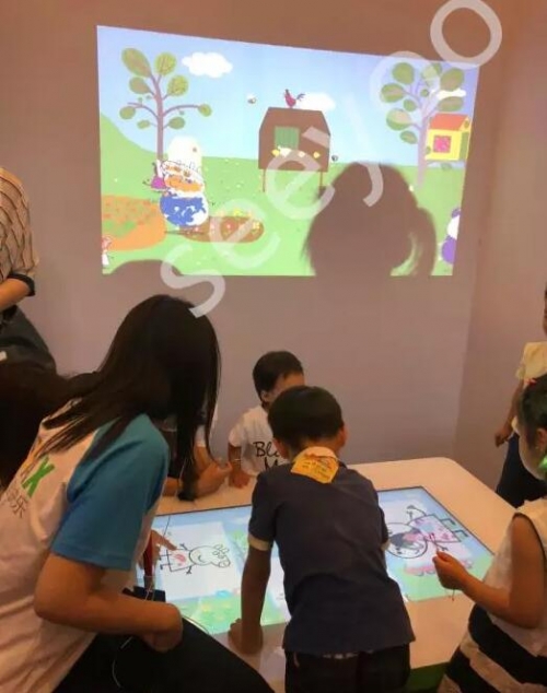 這是一款兒童互動涂鴉系統,數字化娛樂方案,寓教于樂,主要致力于學齡前兒童感官認知和思維創造力的培養。小朋友將通過觸摸桌進行多樣互動,運用AR技術在大屏上生成有趣的動畫場景。