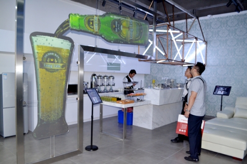 日立創(chuàng)新影像空間充分利用開闊空間,創(chuàng)造了面向商業(yè)、教室、家居等各種應用的精彩方案:迎接賓客的階梯投射與前臺墻面投影令人倍感親切,適合商業(yè)應用的8K巨幕廣告墻、酒瓶異形廣告牌方案引人矚目;面向美術(shù)館、音樂廳的變換燈、激光投影與鋼琴Mapping方案則極具創(chuàng)意;適合商業(yè)樣板間和家具商場的軌道鏡Mapping意趣盎然;模擬高爾夫球方案則是成熟的商業(yè)應用。觀景窗、地面廣告、豎投廣告等方案是創(chuàng)意與商業(yè)的精彩結(jié)合;數(shù)字餐廳實現(xiàn)視覺與味覺的巧妙融合;智能投影壁燈適合打造創(chuàng)意方案等備受與會嘉賓的關(guān)注。