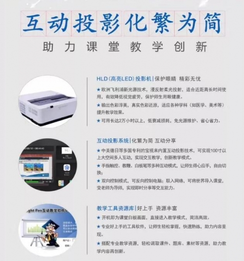 BOXLIGHT寶視來為課堂教學創新提供便利工具,更關注師生健康,積極響應教育部關于加強保護學生視力的號召;本次BOXLIGHT寶視來教學互動系統,采用的是最新HLD光源的投影產品,特點是其一源自歐洲飛利浦研發的HLD新光源技術搭配超短焦光學設計,可實現漫反射柔光投射,適合近距離長時間使用,有效降低視覺疲勞,保護師生用眼健康;其二是HLD光源投影系統色彩輸出淳美,實現真實色彩還原,適應各種學科(如醫學、美術等),提升教學效果;其三,新光源可用長達20000小時以上,低衰減損耗,免光源維護、省心省力。