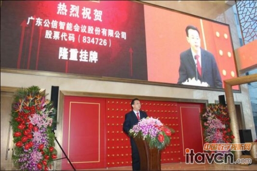 2015年12月30日,廣東公信智能會議股份有限公司(以下簡稱:公信會議)和其他15家企業共同參加了全國中小企業股份轉讓系統在北京金陽大廈3層舉行的“新三板”集體掛牌儀式,成為中國專業會議系統歷史上的第一家在新三板的上市企業。