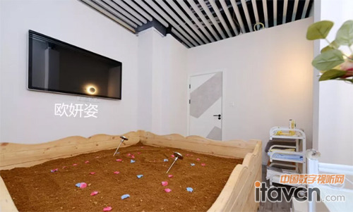 裝在酵素浴服務館上方的55寸數字標牌,一方面介紹歐妍姿獨特的酵素浴中式配方和療效,一方面播放娛樂節目供顧客消遣,受到顧客的好評。