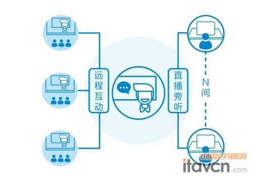 考慮到全國范圍內教育信息化建設不均衡、教學環境條件有差異的情況,同時為滿足“一帶多”的遠程互動需求,希沃互動錄播方案采用了常規錄播交互和直播旁聽結合的“無邊界”互動方式。即1個授課教室,可以同時連接3個遠程教室進行遠程互動,同時還能通過直播鏈接或二維碼的分享,滿足多個旁聽觀摩需求,以提高優課資源的利用率。