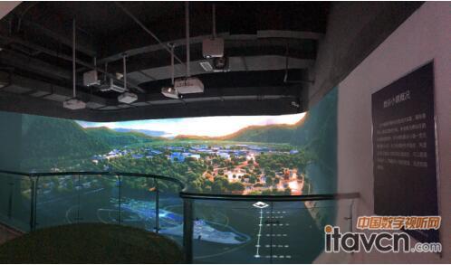 開陽在發(fā)展智慧旅游的同時,還搭上了貴州大數(shù)據(jù)崛起的“順風車”。為進一步提升參觀者對大數(shù)據(jù)實際應用的直觀了解和感官體驗,“數(shù)谷小鎮(zhèn)”展廳利用8臺NEC CR5450W(4500流明亮度、1280×800分辨率)多方位、多角度吊裝,使三面墻體和地面沙盤融合成為一個沉浸式投影畫面。