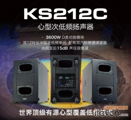 KS212C代表了創新和設計的突破,僅僅依靠單箱體,就呈現供心型指向次低頻揚聲器陣列的所有優勢。KS212C采用最新的DSP處理技術,將兩個12”的超低音單元安裝在兩個六階帶通箱體內,保證設備前方投射的聲能比后方多15dB,為移動娛樂、演出租賃以及中等場所的演出提供良好的低音效果。