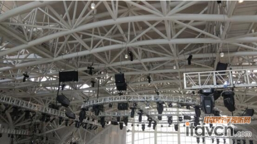 中間圓形舞臺的主擴聲揚聲器由EAW QX364和QX366組成,共分成8組。QX364角度60°H×45°V覆蓋二層觀眾區(qū),QX366角度60°H×60°V覆蓋一層觀眾區(qū)。8組揚聲器組圍繞中心舞臺均勻吊掛安裝,吊掛高度約13米。