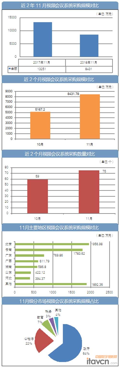 【中國數(shù)字視聽網(wǎng)訊】據(jù)《政府采購信息報》記者不完全統(tǒng)計,11月,全國范圍實際完成的視頻會議系統(tǒng)采購項目約75個,采購規(guī)模約為8431.78萬元。其中,北京和云南視頻會議系統(tǒng)采購規(guī)模均在千萬元以上。